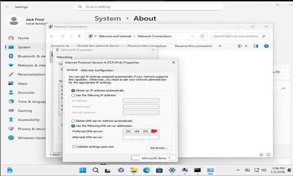 - Configured the client’s preferred DNS server to point to the domain controller’s IP address