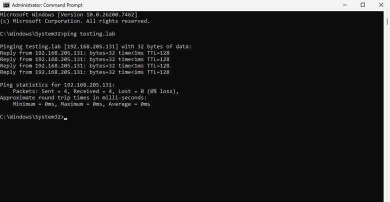 To confirm proper communication between the client and domain controller, I performed a connectivity test using ping: